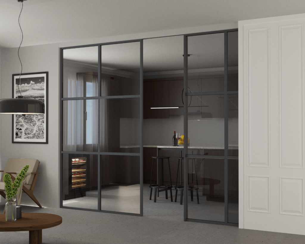 Sistema de división de interiores con diseño minimalista que potencia la sensación de amplitud y luminosidad.